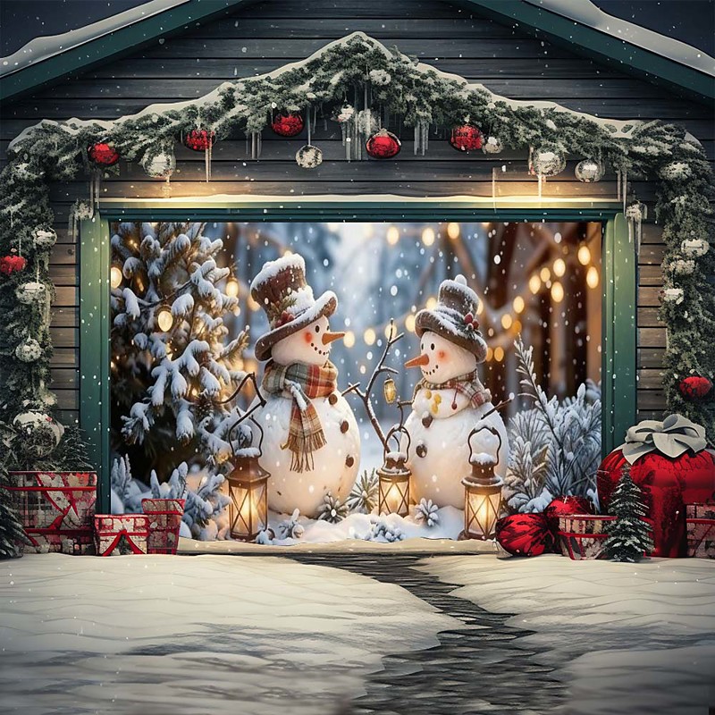 Christmas Garage Door Cover – Festive Outdoor Decoration Banner, Santa Snowman Christmas Tree Pattern Waterproof Garage Curtain for Holiday Home Decor