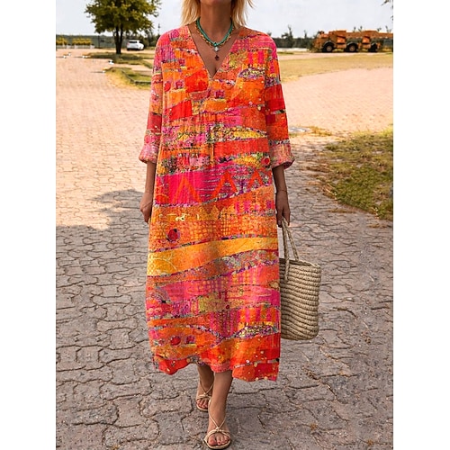 Damen Maxikleid Leinenähnlich Atmungsaktiv Leicht Kaftan 3/4 Länge Ärmel Rundhalsausschnitt Lässiges Kleid A-Linie Kleid Boho Reguläre Passform Grafisch Geometrisch Abstrakt Weiß Gelb Blau Orange