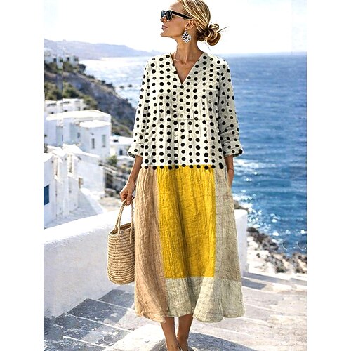 Per donna Abito Midi Finto cotone e lino Vestito a caftano Moda Essenziale Moderno Quotidiano All'aperto Ferie Vestibilità regolare Semplice Manica Lunga Scollo a V Giallo Chiaro Nero Vino Blu marino