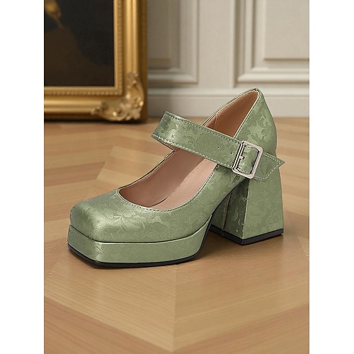 Mary Jane con plateau in similpelle verde floreale da donna con fibbia - tacchi a blocco grossi vintage anni '50 per occasioni formali, feste e matrimoni