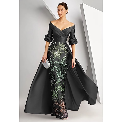 Abito da ballo Linea ad A Lunghezza al pavimento Abito da Sera Da principessa Abito formale Elegante Scintillante Stile Celebrità Manica 3/4 Scollo a Barca Festa in giardino Matrimonio Raso Crepe
