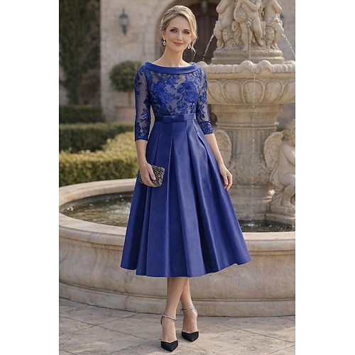Linea ad A Abito Lunghezza Tè Vestito da Festa Abito da Cocktail Abito da invitata a nozze Abito da cerimonia per signora Manica 3/4 Scollo a Cascata Elegante Semplice Alto Basso Formale Raso con