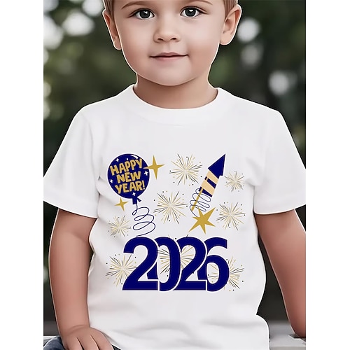 Jungen-T-Shirt mit 3D-Print und Buchstabenmotiv für die Neujahrsparty 2026, Kurzarm, Sommer/Frühling, Sportmode, Streetwear, Kindergröße 4-12 Jahre, Rundhalsausschnitt, normale Passform, Outdoor,