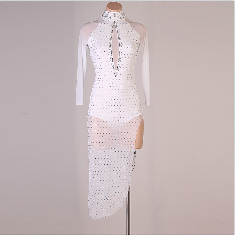 Latin Salsa Dance Dress Rhinestone Tassel Splicing Women's Performance Training Long Sleeve Mesh Milk Fiber