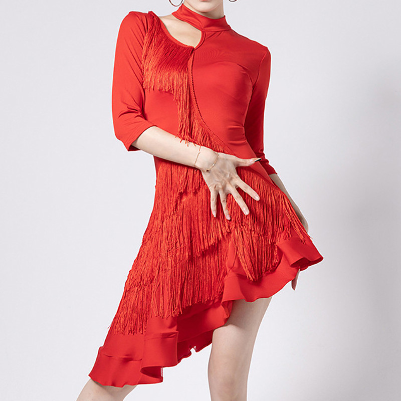 Latin Dance Dress Fringed Tassel Ruching Hollow-out Women's Performance Training Half Sleeve High Polyester