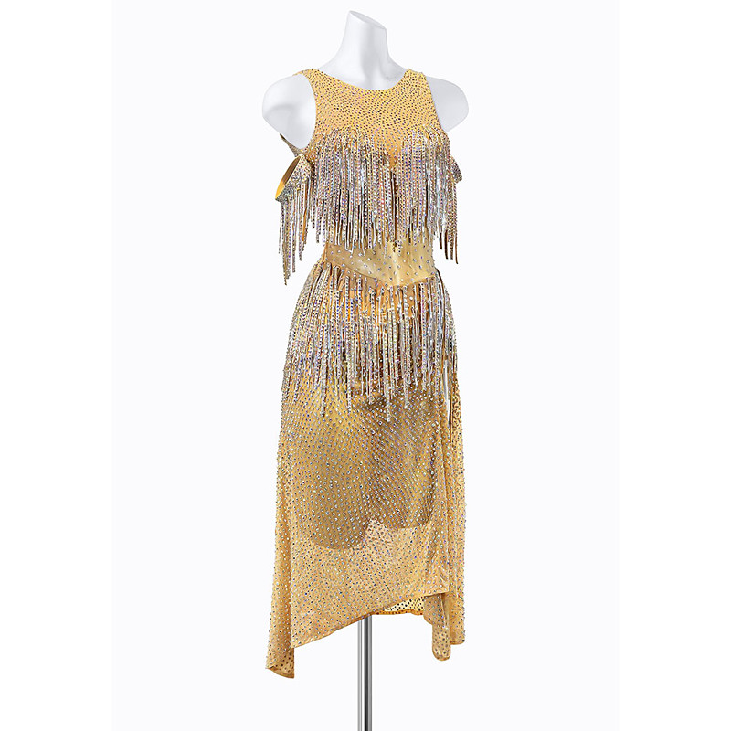 Women's Gold Rhinestone Fringe Latin Dance Dress - Sleeveless Cold Shoulder Multi-Layered Asymmetrical Ballroom Performance