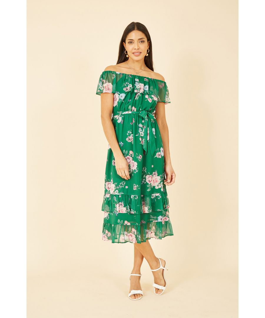 Yumi Womens Green Floral Bardot Midi Dress With Frill Hem - Size 10 UK | Yumi Sale | Discount Designer Brands