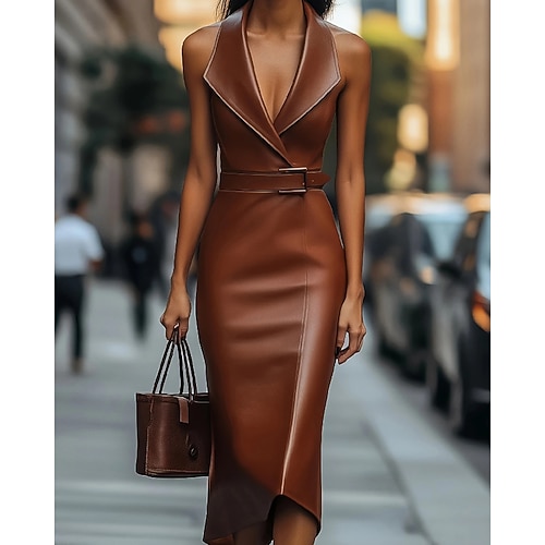 Per donna Abito Midi Attillato Abito in pelle Elegante Moda Moderno All'aperto Feste Uscire Vestibilità regolare Semplice Senza Maniche Girocollo Marrone Primavera Autunno