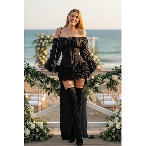 Linea ad A Asimmetrico Corto Mini Abito Vintage Abito sopragonna Abiti per invitati a matrimoni Elegante Manica Lunga Scollo Tondo Matrimonio San Valentino con Volant