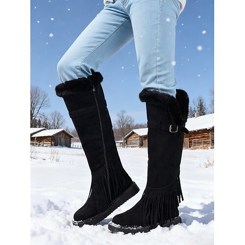 stivali invernali da donna in pelle scamosciata verde con fodera in pelliccia e dettaglio con frange – comodi stivali da neve alti fino al ginocchio per il freddo