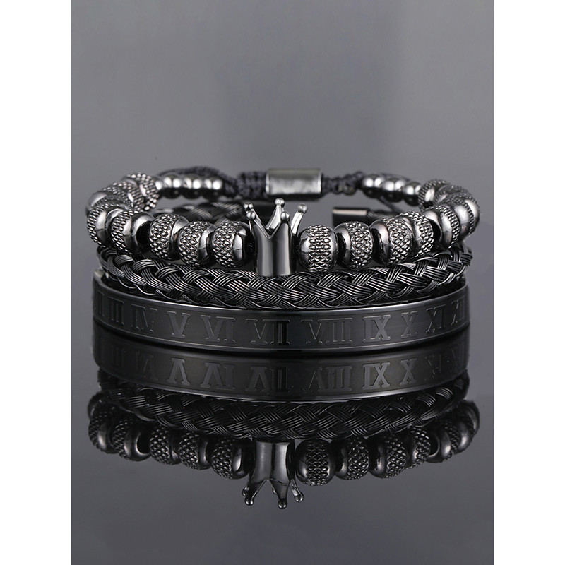 Men's Gold Stainless Steel Bracelet Set – 3-Piece Crown Beaded, Braided Cuff, and Roman Numeral Bangle for Fashionable Outfits, Parties and Special Occasions