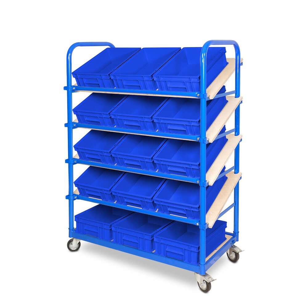 BRB Schrägboden-Regalwagen mit 5 Ebenen, BxTxH 1050x500x1450 mm, 4 Lenkrollen, 2 Rollen mit Feststellbremse mit 15 Euroboxen BxTxH 400x300x120 mm