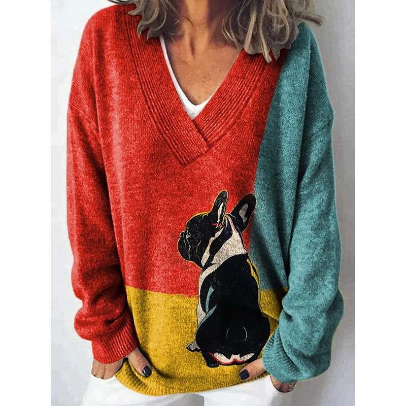 Women's Sweater Casual Soft Animal Color Block Ribbed V Neck Knitted Long Sleeve Regular Tops Knit Outdoor Daily Weekend Yellow Red Fall Winter