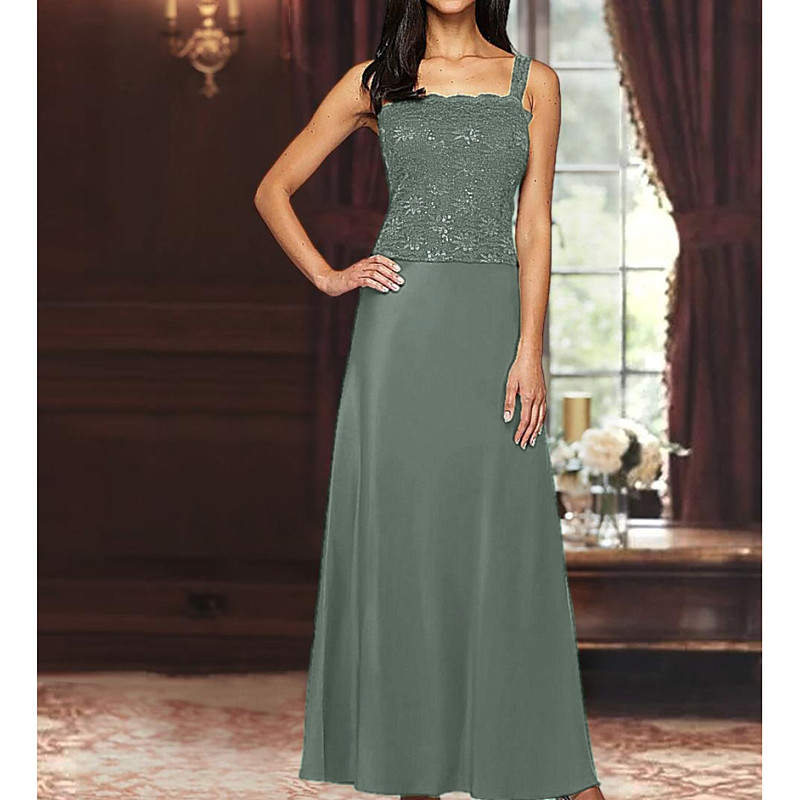 A-Line 3 Piece Floor Length Wedding Guest Dress Mother of the Bride Dress 3/4 Length Sleeve Square Neck Elegant Simple Luxurious Formal Wedding Guest Satin Lace with Lace Sequin