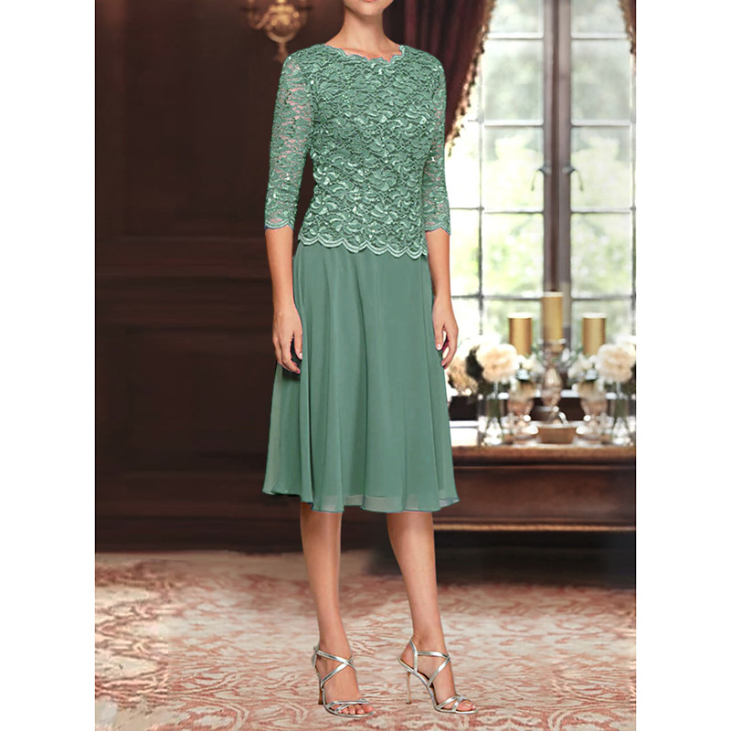 A-Line Knee Length Party Dress Cocktail Dress Wedding Guest Dress Mother of the Bride Dress 3/4 Length Sleeve Boat Neck Elegant Simple Minimalist Formal Wedding Guest Chiffon Lace with Lace Sequin