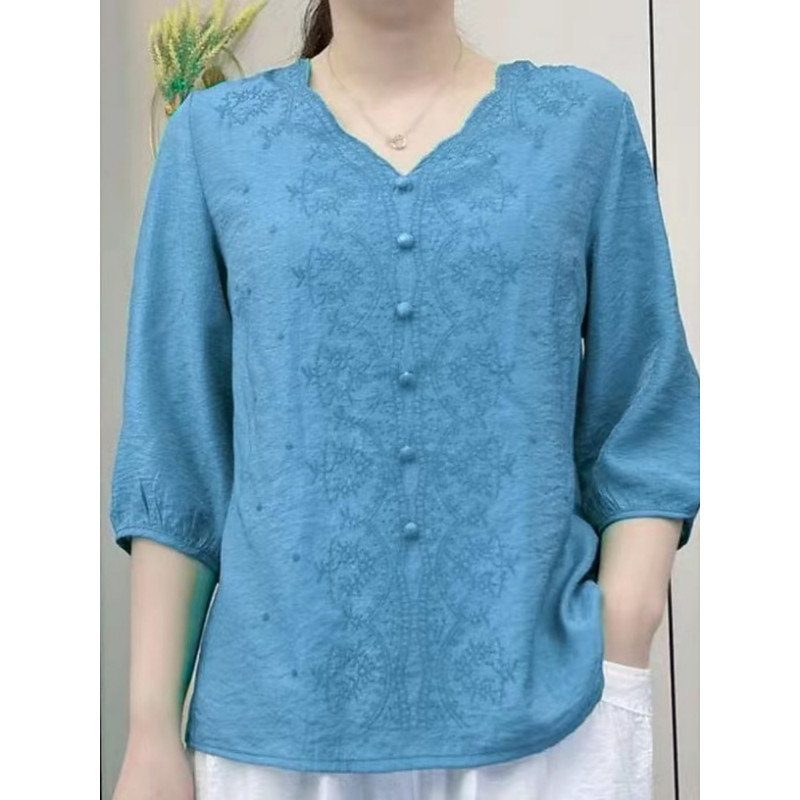Women's Blouse Solid Color Daily Stylish Casual 3/4 Length Sleeve V Neck Regular Tops Daily Lace Embroidered Buttons Blue White Yellow Pink Navy Blue Summer Spring Fall