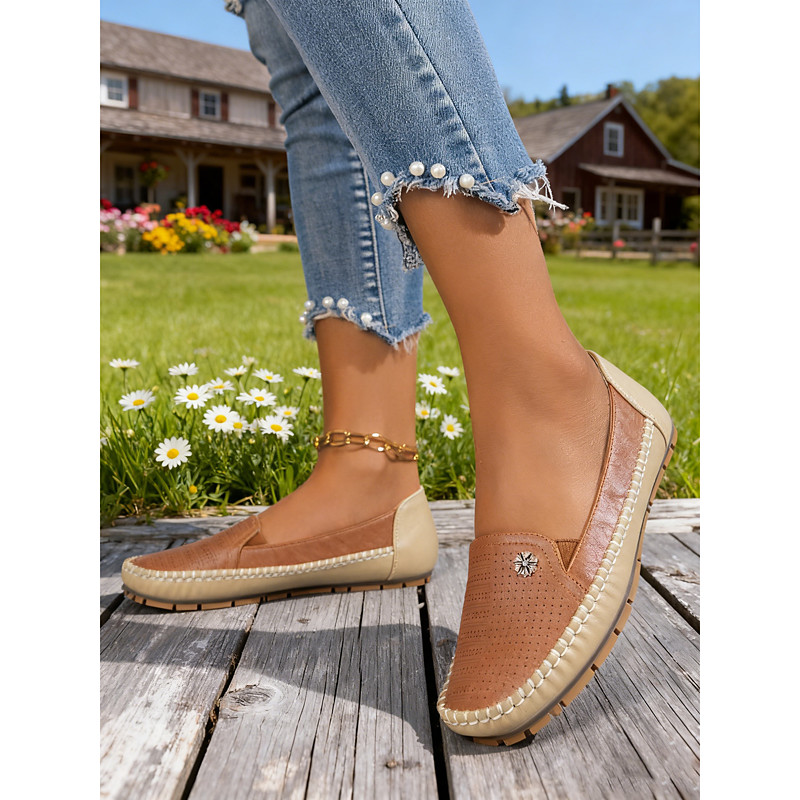Women's Camel Perforated Slip-On Flats with Leather and Beige Contrast – Comfortable Summer Casual Shoes for Outdoor Activities, Travel and Everyday Wear