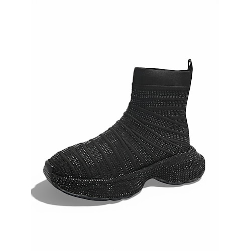 Schwarze Damen-Ankle-Boots mit Strasssteinen, klobige Stretch-Schuhe für Partys und das Nachtleben