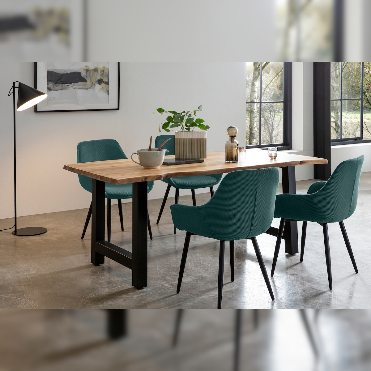 SalesFever 5-tlg. Akazie-Tischgruppe | 160 x 85 cm | Platte 35 mm natur | Metallgestell schwarz | 4 Stühle mit Cord-Optik | grün – schwarz