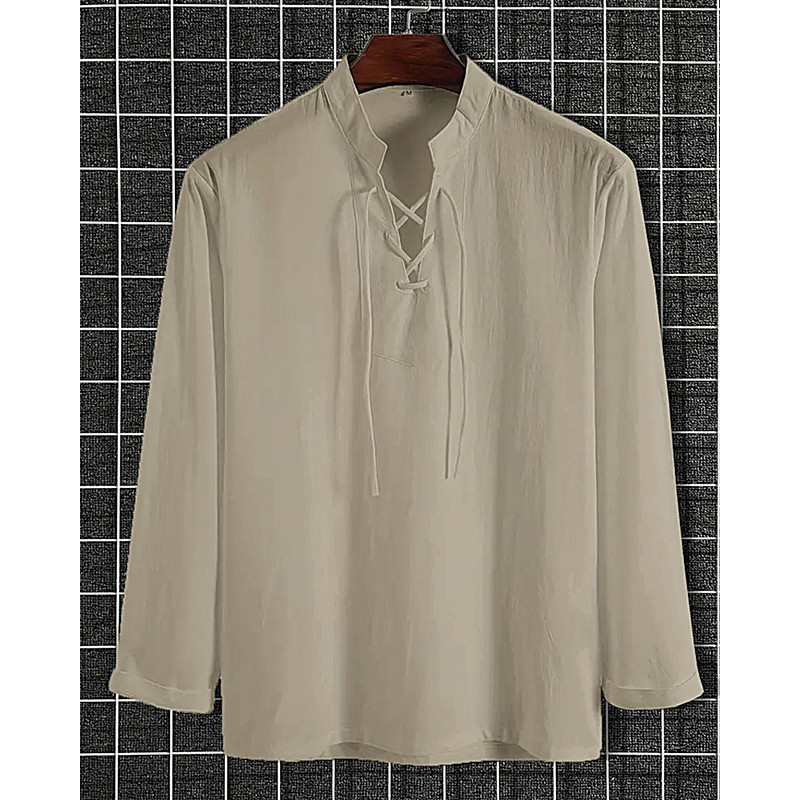 Men's Shirt Casual Shirt Cotton Shirt Plain Hawaiian Holiday Black White Khaki Long Sleeve Band Collar Spring Fall Clothing Apparel Lace up
