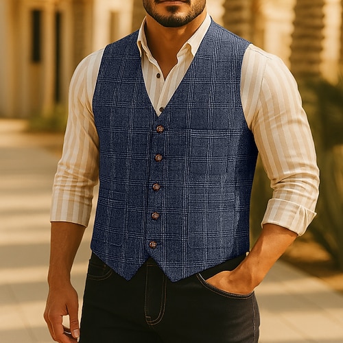 Per uomo Gilet Gilet in tweed Formale Matrimonio Vacanza Casuale Moda Classico Primavera Autunno Tasca Bottoni Poliestere Tessuto Confortevole Plaid Monopetto Scollo a V Vestibilità regolare Nero