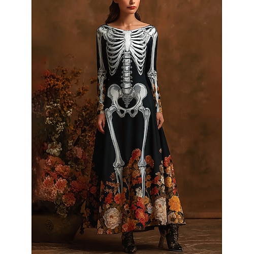 Abito Maxi da donna Scheletro Abito Sheath Abito A-Line Casual Boho Incarico da Matrimonio Spiaggia Vestibilità Regolare Grafica Floreale Manica Lunga Collo Giro Collo Barchetta Blu Viola Arancione