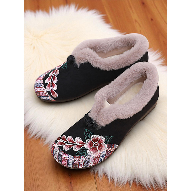 Women's Red Embroidered Fur-Lined Slip-on Shoes with Floral Pattern, Warm Winter Shoes for Christmas, Holiday Season and Casual Wear