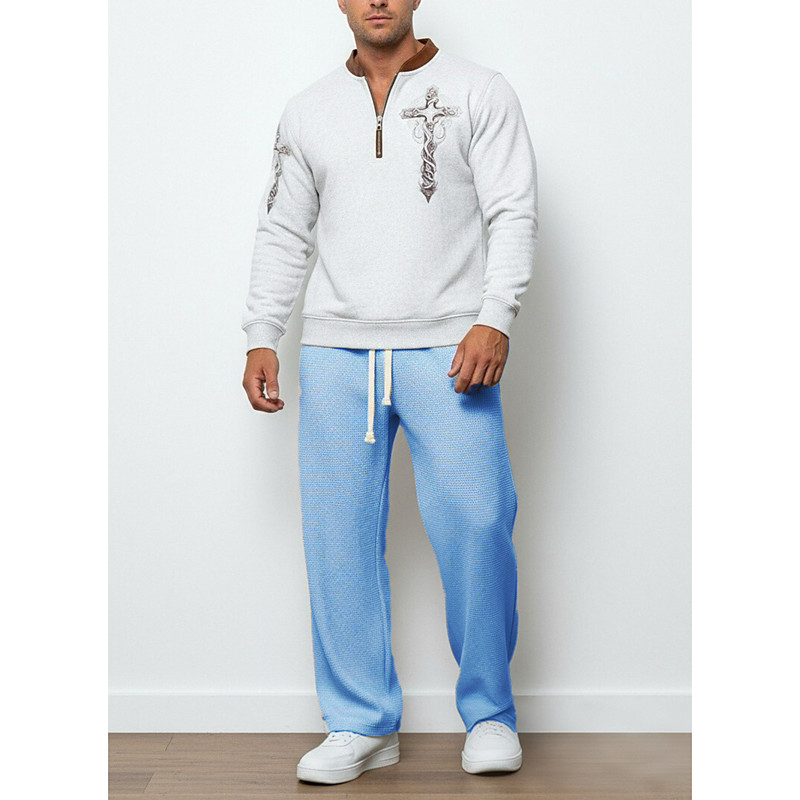 Men's Sweatshirt Tracksuit Sweatpants Outfit Set Stand Collar Outdoor Daily Sports Drawstring Pocket Half Zip Color Block Cross White Sky Blue Grey Activewear Fashion Streetwear Spring
