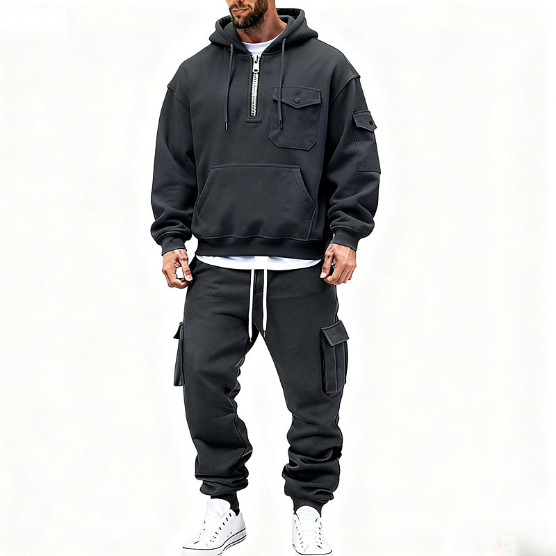 Men's Hoodie Tracksuit Hoodie Pants Set Hoodie Daily Outdoor Vacation Daily Wear Drawstring Pocket Half Zip Plain Black Navy Blue Royal Blue Activewear Sports Fashion Fall