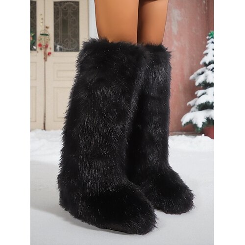 stivali alti fino al ginocchio in pelliccia sintetica da donna – stampa in bianco e nero, comode calzature invernali per un freddo all'avanguardia e uno stile vacanziero