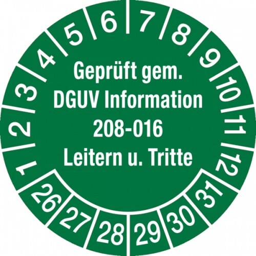König Werbeanlagen Prüfplakette ab 26, DGUV Information 208-016 Leitern und Tritte, grün/weiß, Ø 30 mm - Bogen = 10 Plaketten - 30 mm Folie selbstklebend
