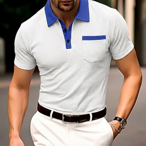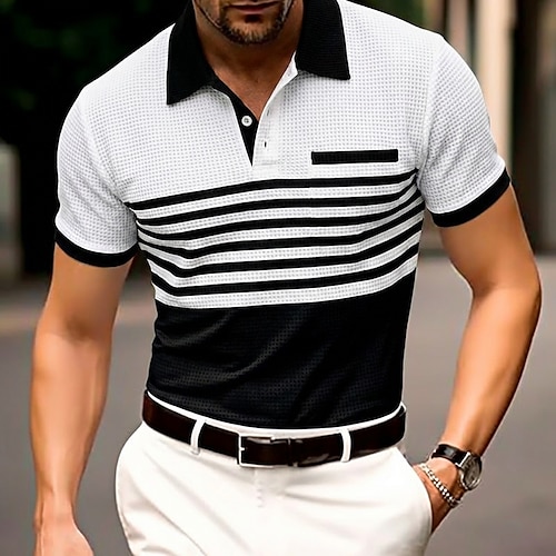 Per uomo Maglia da golf Polo a Maglia Waffle Casuale Affari Classico Manica Corta Moda Moderno Tinta unica A righe Tasca Blocco di colore Estate Primavera Vestibilità regolare Nero Bianco Blu reale