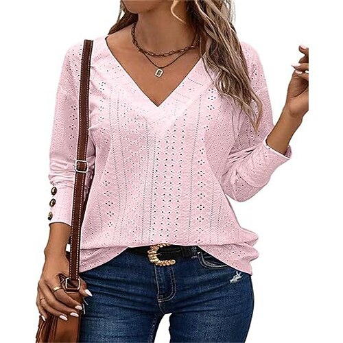 Per donna Maglietta Tinta unica Elegante Moda Classico Manica Lunga Scollo a V Top Regolari Quotidiano Uscire Weekend Pizzo Patchwork Traforato Nero Bianco Rosa Rosa polverosa Blu Reale Autunno