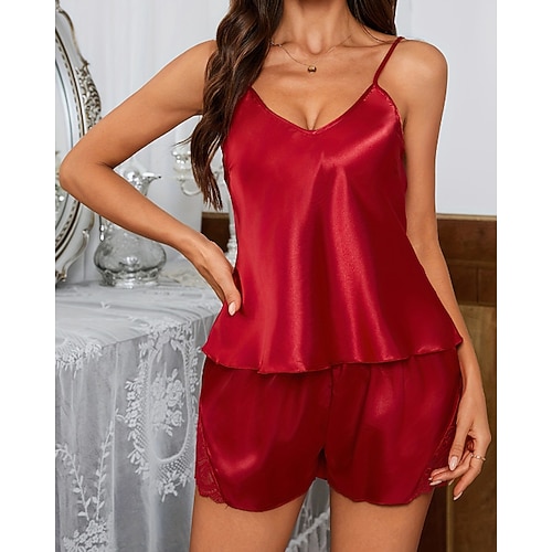 Camicia da notte in raso da donna, sexy, casual, in pizzo, tinta unita, senza schienale, per tutti i giorni, per casa, letto, senza maniche, spalline, nera, champagne, rosa, rosso, blu navy, estiva, vestibilità regolare