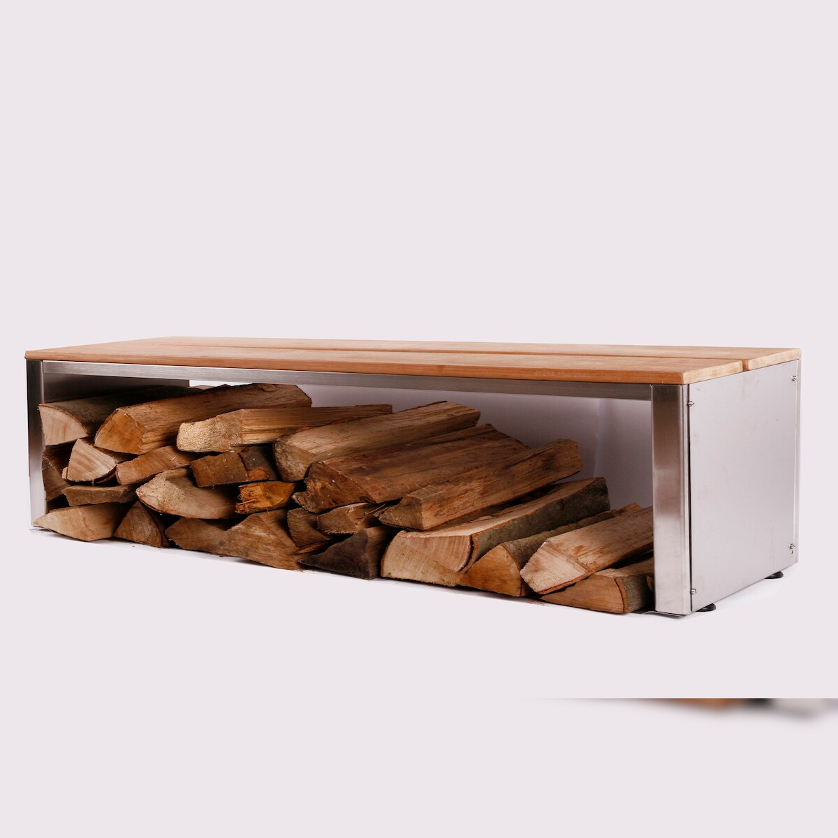 Szagato Sitzbank mit Holzlager 200x30cm, Edelstahl (Holzlagerbank, Bank mit Kaminholz / Brennnholz)