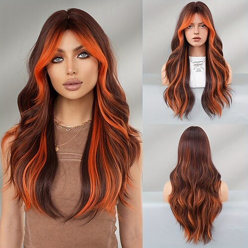Synthetische Perücke für Frauen, hitzebeständig, lang, gewellt, mit Vorhangpony, perfekt für Weihnachtsfeiern