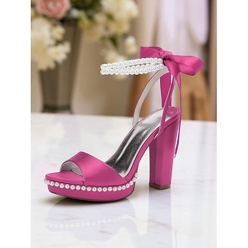 Sandali con plateau in raso rosa da donna con cinturino alla caviglia in perle e fiocco - eleganti sandali con tacco alto per cocktail party ed eventi formali