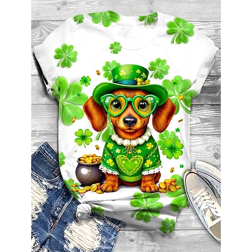 T-shirt da donna per il giorno di San Patrizio grafica cane shamrock vintage elegante classico maniche corte colletto tondo top regolare stampa giornaliera verde scuro verde off-white estate primavera