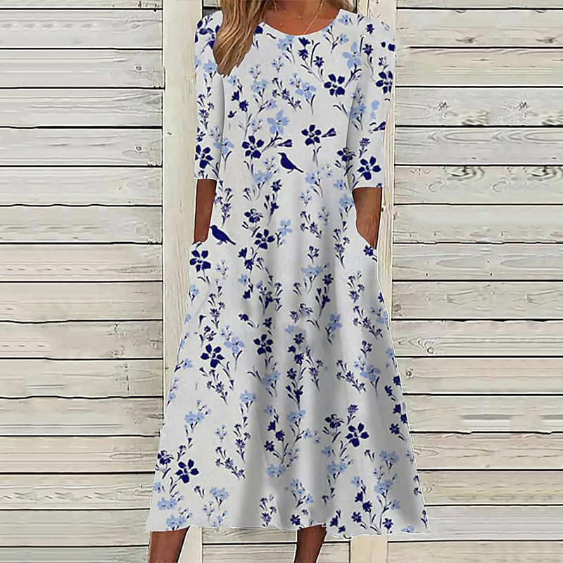 Women's Long Dress Maxi Dress Casual Dress Floral Dress Classic Modern Daily Outdoor Going out Regular Fit Flower Long Sleeve Crew Neck Blue White Fall