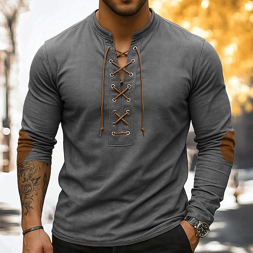 Herren Henley Hemd T-Shirt Langarmshirt Langarm Henley Sommer Herbst Farbblock Mode Designer Basic Schnürung Urlaub Straße Lässig Marineblau Dunkelgrau Armeegrün Top T-Shirt für Herren