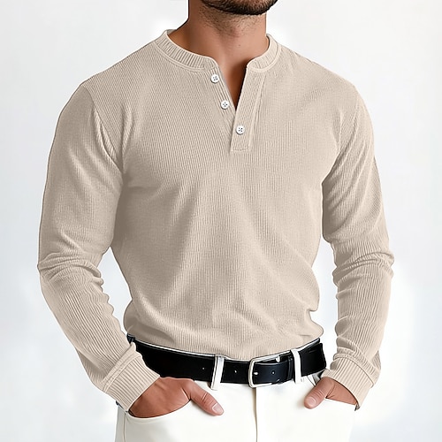 Herren Waffel T-Shirt T Shirt Henley Hemd Langarm Einfarbig Strickware Täglich Knöpfe Henley Outdoor Lässig Athleisure Frühling Herbst Frühling Herbst Marineblau Schwarz Weiß Henley T-Shirt