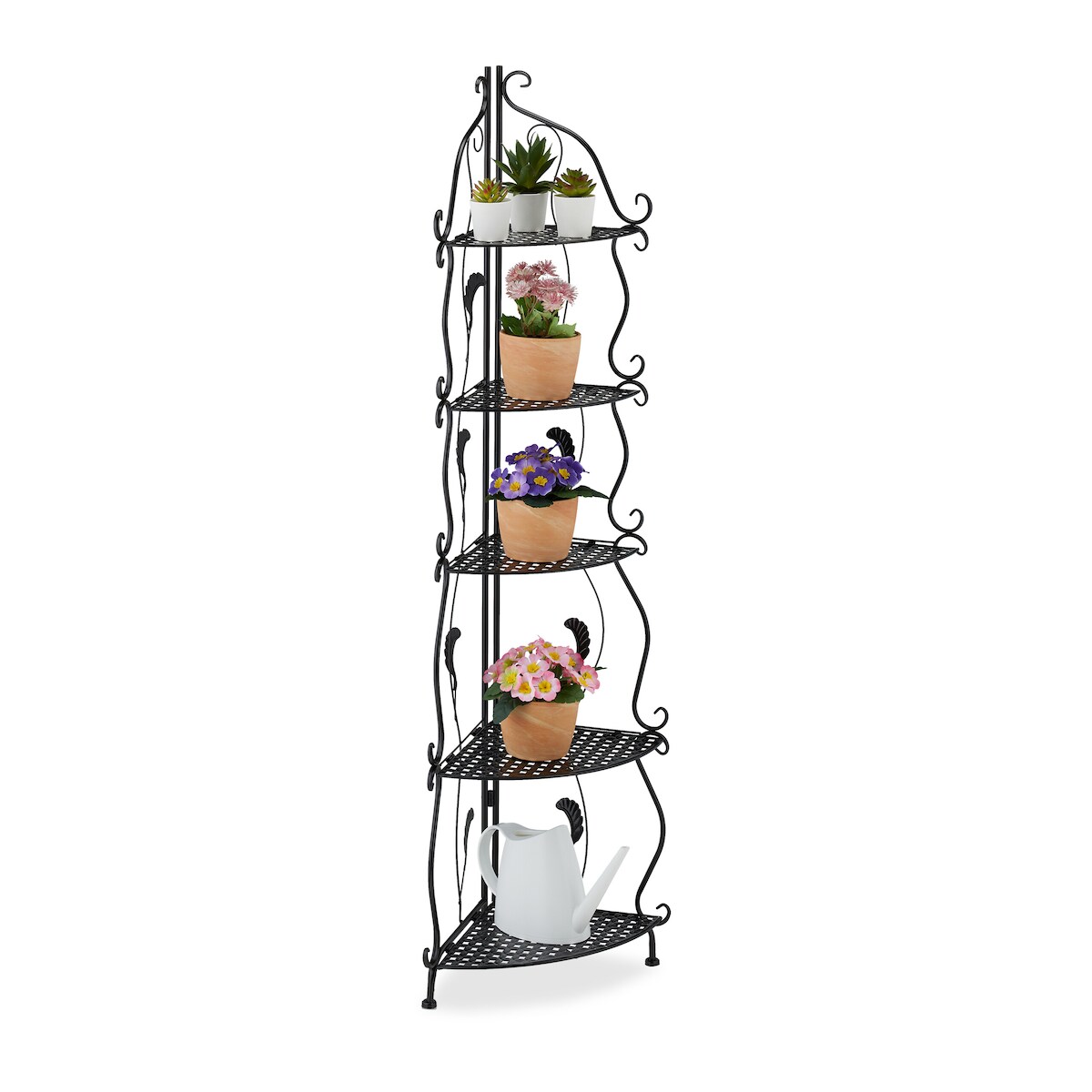 Relaxdays Eckregal Metall, 5 Ablagen, HBT: 136 x 30 x 30 cm, Pflanzenregal freistehend, klappbar, Vintage-Look, schwarz