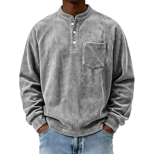 Per uomo Maglietta Camicia di Velluto a Coste Maglia Henley Manica Lunga Henley Primavera Autunno Tinta unica Vintage Streetwear Elegante Tasca Manica corta Quotidiano All'aperto Vacanza Nero Blu