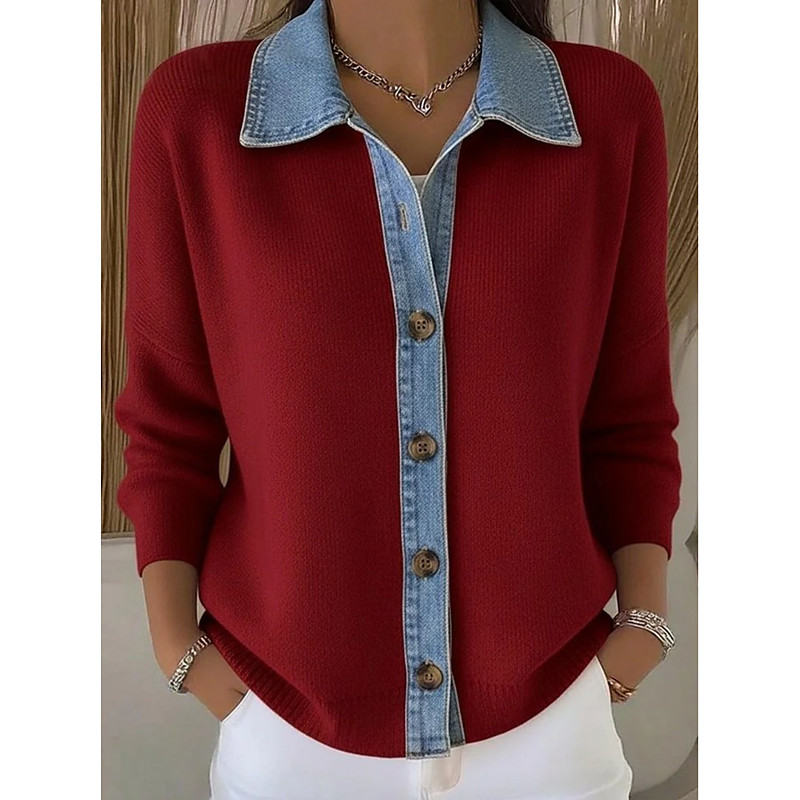 Women's Sweater Elegant Vintage Shirt Collar Patchwork Long Sleeve Regular Tops Knit Wine Red Pink Fall Winter