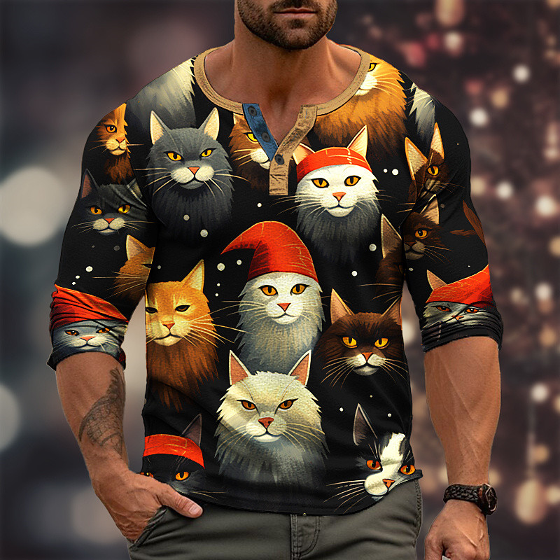 Christmas Men's Santa Claus Henley T Shirt Graphic Hat Fashion Daily Casual 3D Print Henley Casual Holiday Going out Red Brown Green Long Sleeve Henley Spring Fall Clothing Apparel S M L XL XXL