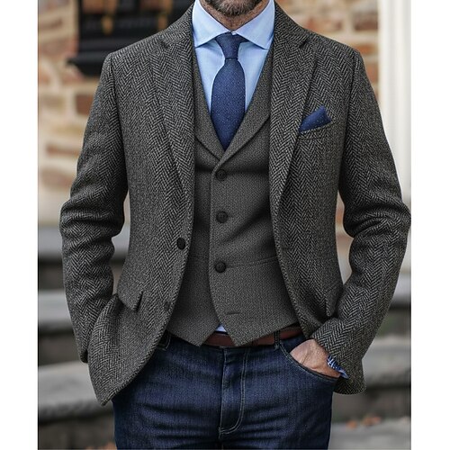 Herren Tweedblazer Notch-Kragen Vintage Klassisch Lässig Fischgrätenmuster Blazer Braun Grau Figurbetonter Schnitt Einreihig Zwei-Knöpfe