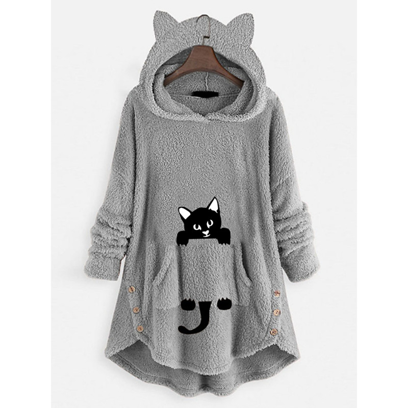 Women's Pullover Hoodie Sweatshirt Cat Casual Long Sleeve Hooded Long Tops Street Dailywear Casual Buttons Print Front Pocket Pink Wine Gray Fall Winter