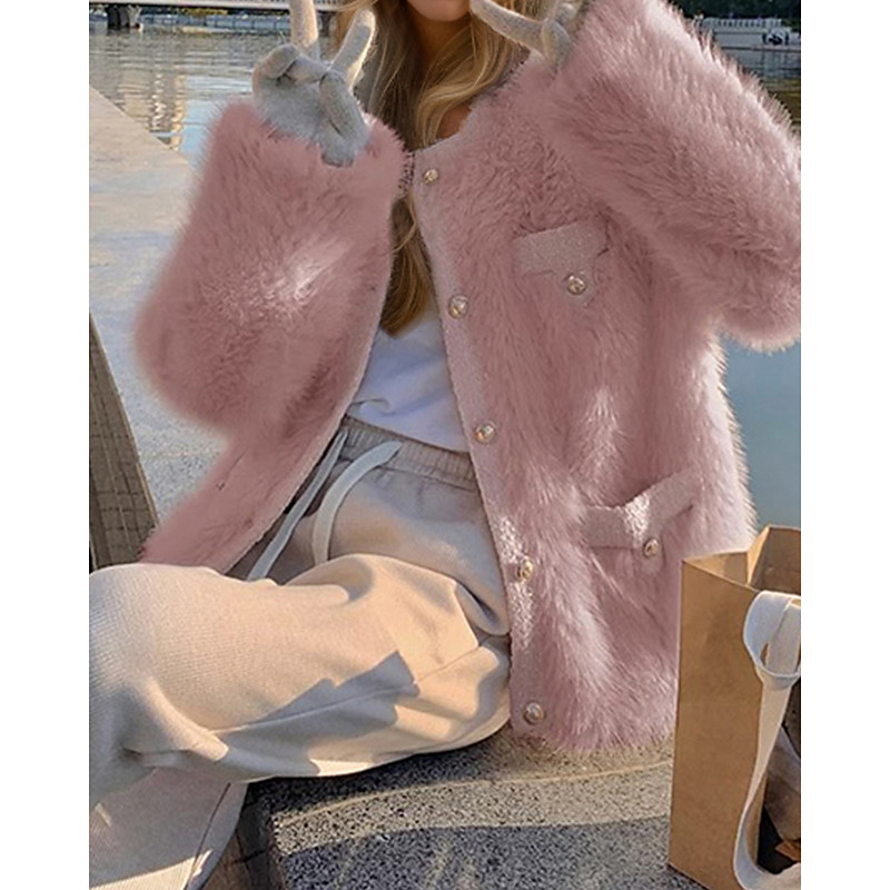 Women's Winter Coat Faux Fur Coat Warm Comfortable Pocket Buttons Casual Plain Outdoor Vacation Going out Weekend Long Crewneck Regular Fit Long Sleeve Outerwear Pink Beige Fall Winter