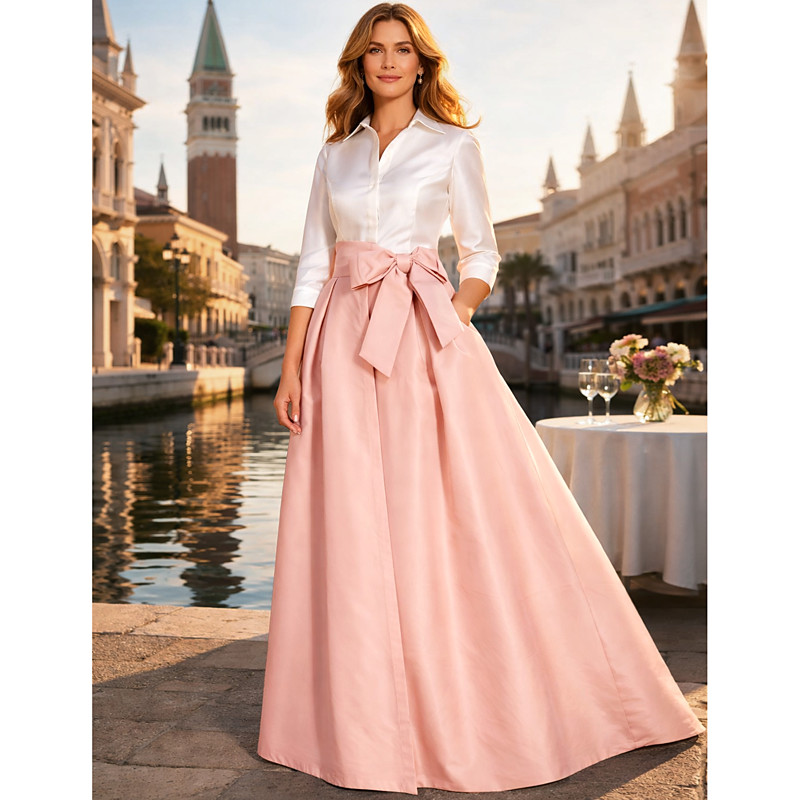 A-Line Floor Length Shirt Dress Wedding Guest Dress Formal Dresses Mother of the Bride Dress 3/4 Length Sleeve Shirt Collar Cute Minimalist Formal Evening Taffeta with Bow(s) Splicing