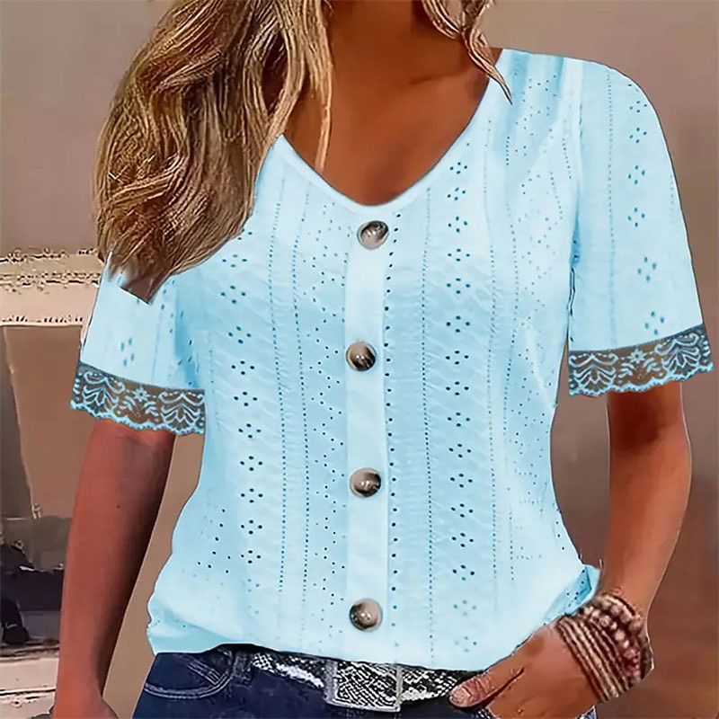 Women's Lace Splicing Top Summer Tops Blouse Dressy Tops Plain Elegant Vintage Ladies Short Sleeve V Neck Regular Tops Daily Work Holiday Ruched Lace Patchwork Blue White Light Purple Summer Spring